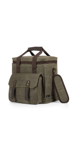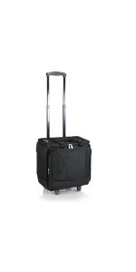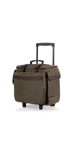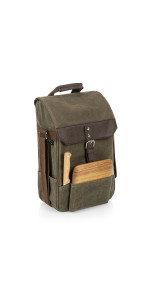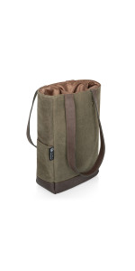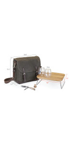 Roll hard to the picnic or wine club pickup party with the Bodega Wine Cooler Tote; a rolling beverage cooler with a push-button-release telescoping handle. This rolling cooler features a spacious water-resistant-lined interior that holds 12 wine bottles or 40 standard size cans; and the three exterior pockets are large enough to hold 3-ring binders (tasting notes?) and other personal effects. Made of polyester canvas with a heavy-duty comfort grip top handle and two locking clasps to secure its contents; you can be assured the Bodega will protect and insulate your best bottled beverages at just the right temperature while on the go. Measures 15 by 14.3 by 17. Because convenience is cool - and this is how we roll.